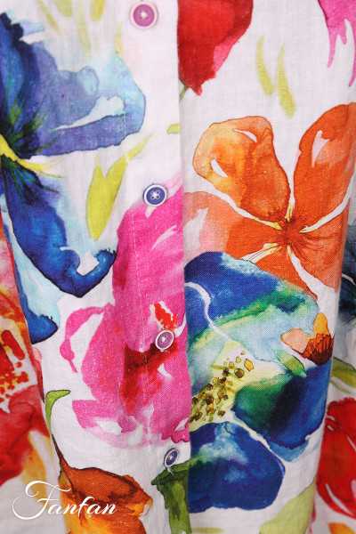 Wunderschöner trapezförmiger Leinenrock, vorne komplett zugeknöpft mit verschiedenfarbigen Knöpfen, schräge Seitentaschen, sehr schöner Druck aus einem Werk von Basak Erarsla "Spring de light". Fällt relativ klein aus. Bitte kontaktieren Sie uns, um die Maße der für Sie interessanten Größen zu...