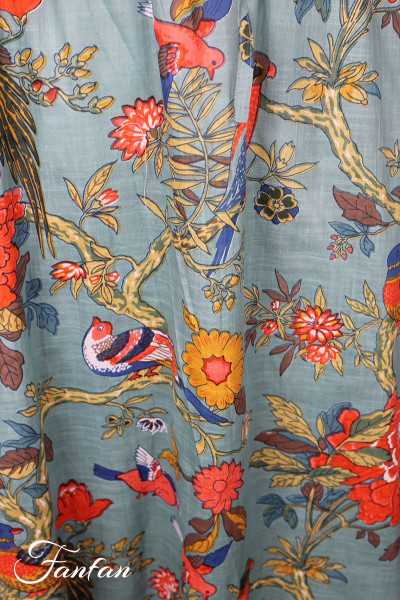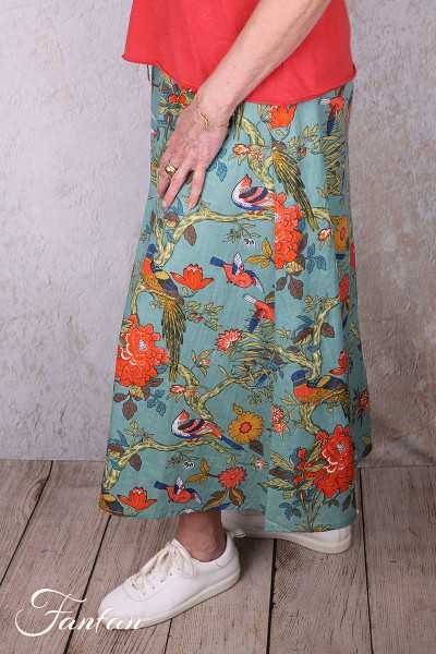 Halblanger Rock aus leichter Baumwolle mit schönem Druck mit Vögeln und Blumen, ideal für die warme Jahreszeit, Taille mit Gummizug und Bindeband vorne, trapezförmiger Schnitt, unten ausgestellt, versteckte Taschen an den Seiten.