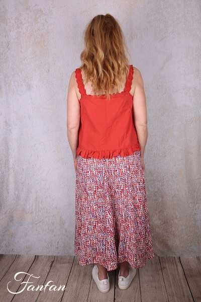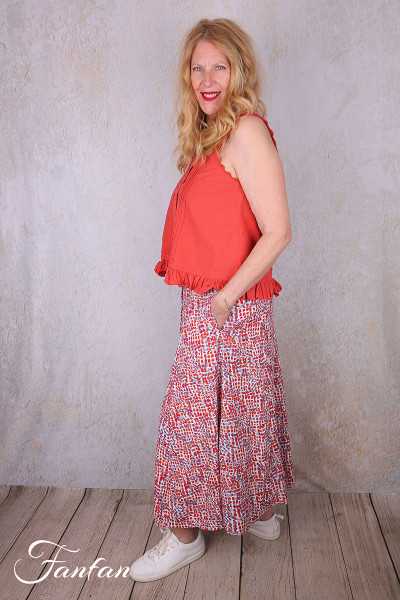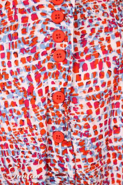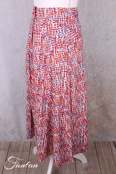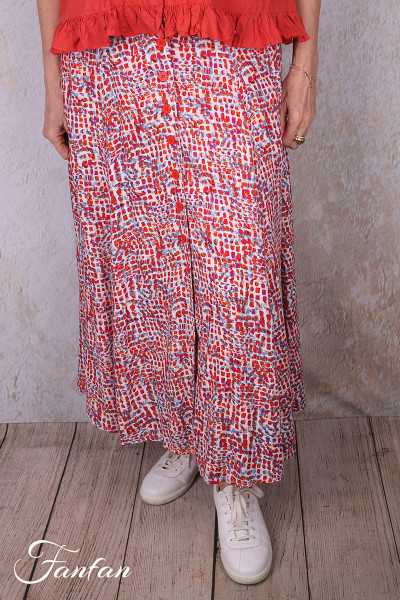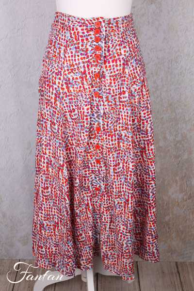 Halblanger Rock aus Viskose mit kleinem Druck in Rot- und Blautönen, vorne komplett zugeknöpft, unten ausgestellter Glockenschnitt, gefüttert einfarbig cremefarben