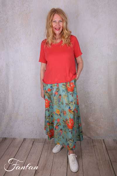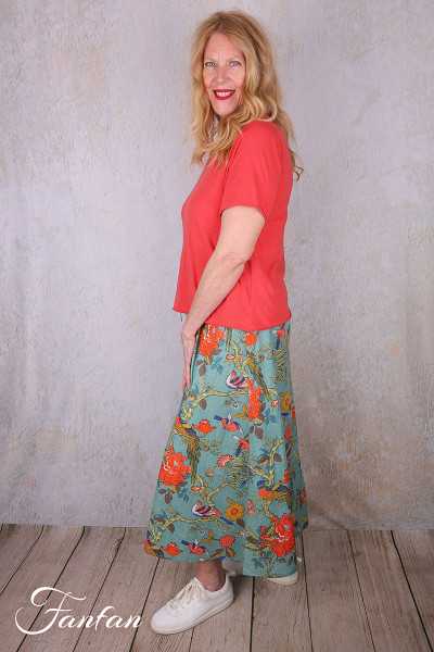 BlaBla Rock aus Bio-Baumwolle mit schönem Druck in Orange, Rosa und Grün, trapezförmiger Schnitt mit zwei abgerundeten Seitenteilen, Reißverschluss am Rücken