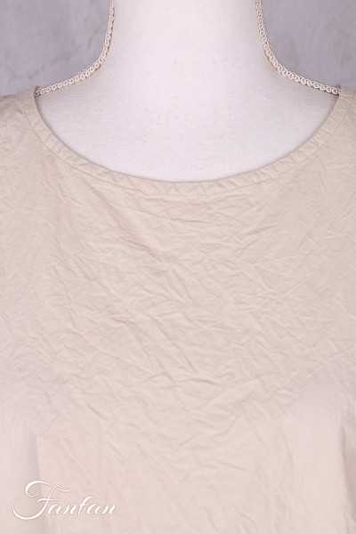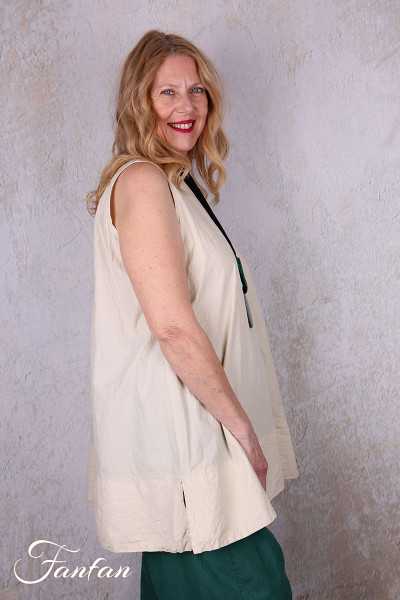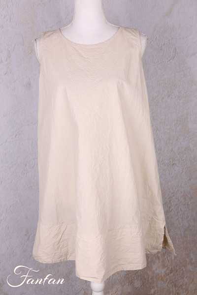 Lange Tunika oder kurzes ärmelloses Kleid, Rundhalsausschnitt, geknitterte Baumwolle, Trapezschnitt mitd doppelter Borte unten, kleiner Schlitz an den Seiten. Breite Taille
