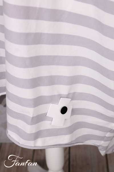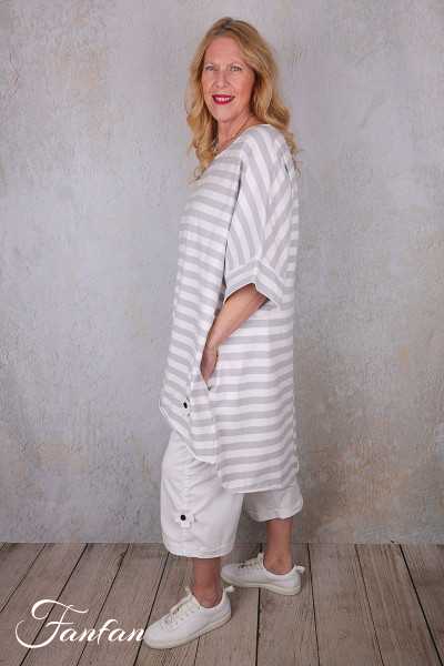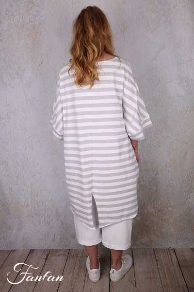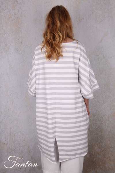 Wunderschönes lockeres Longtop aus gestreifter Stretch-Baumwolle, fallende kurze Ärmel, großer Rundhalsausschnitt, hinten länger geschnitten mit 2 Zacken, großes Patchwork-Kreuz im Rücken, Verarbeitung mit Rollsäumen, 2 versteckte Taschen in den Nähten.