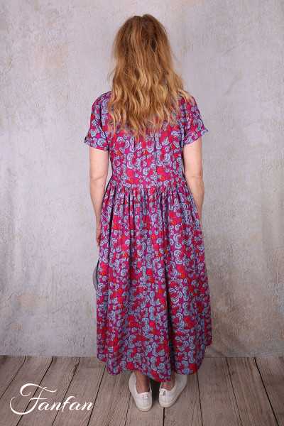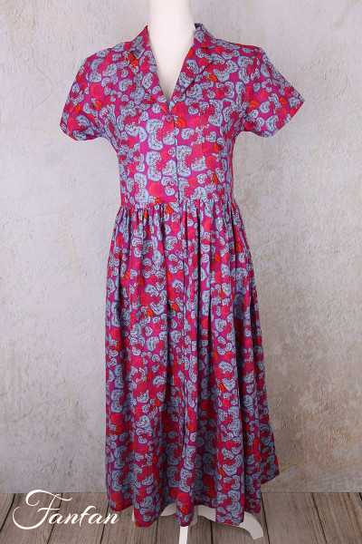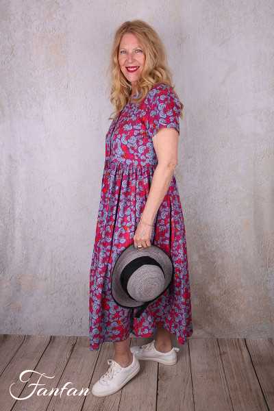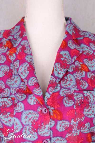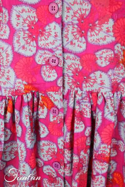 Sehr hübsches halblanges Kleid aus Bio-Baumwolle mit schönem fuchsiafarbenem und blauem Druck, kurze Ärmel, vorne vollständig geknöpft, V-Ausschnitt mit doppeltem Revers, aufgesetzte Brusttaschen, in der Taille gerafft mit schöner Weite im unteren Bereich.