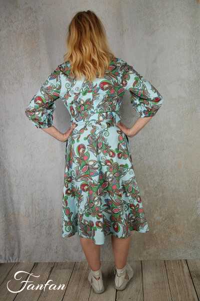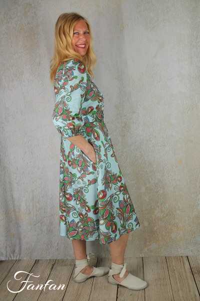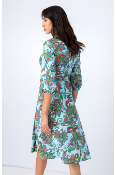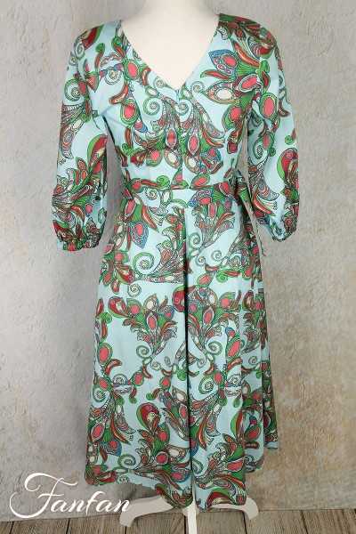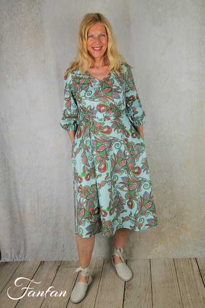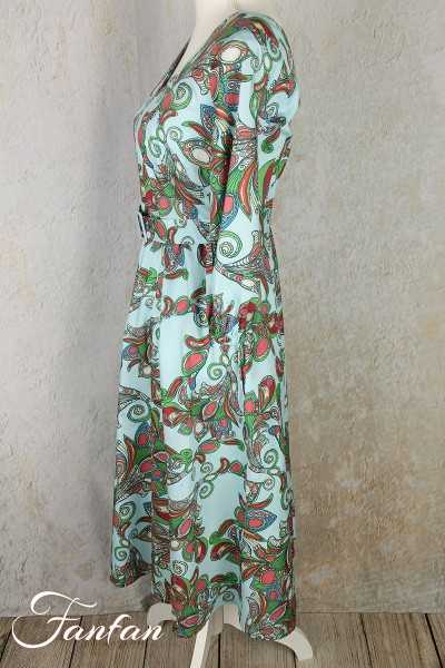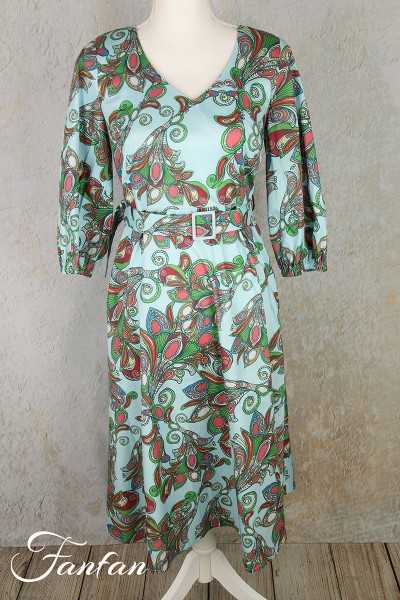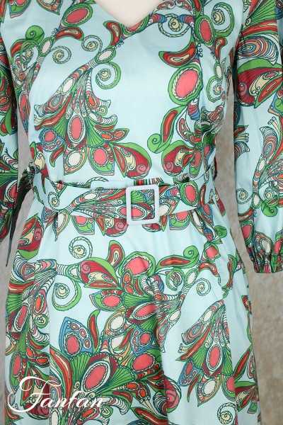 Sehr hübsches Kleid aus Baumwollpopeline mit schönem blauem, grünem und rosafarbenem Aufdruck, 3/4-Ärmel mit Gummizug unten, V-Ausschnitt vorne und hinten, Reißverschluss hinten, taillierter Schnitt mit schönem ausgestelltem Saum, Gürtel aus farblich abgestimmtem Stoff