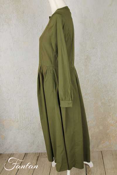 Jolie robe en coton kaki, manches longues avec poignet à bouton, col rond, boutonnée sur l'avant, ceintré à la taille puis plis plats et évasée dans le bas, poches cachées dans les coutures