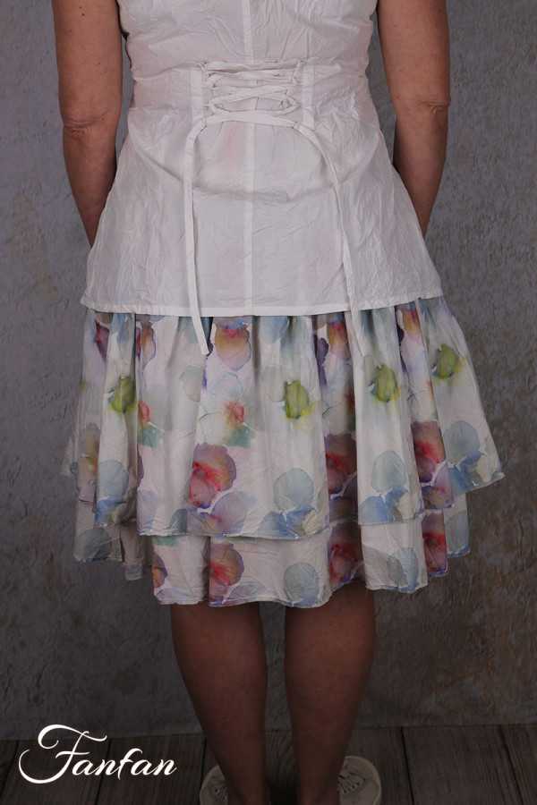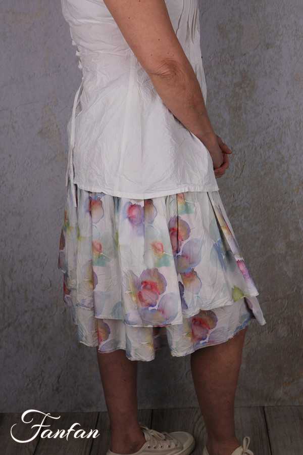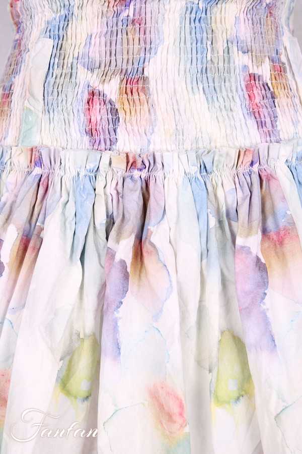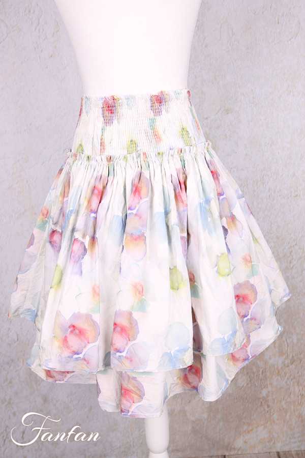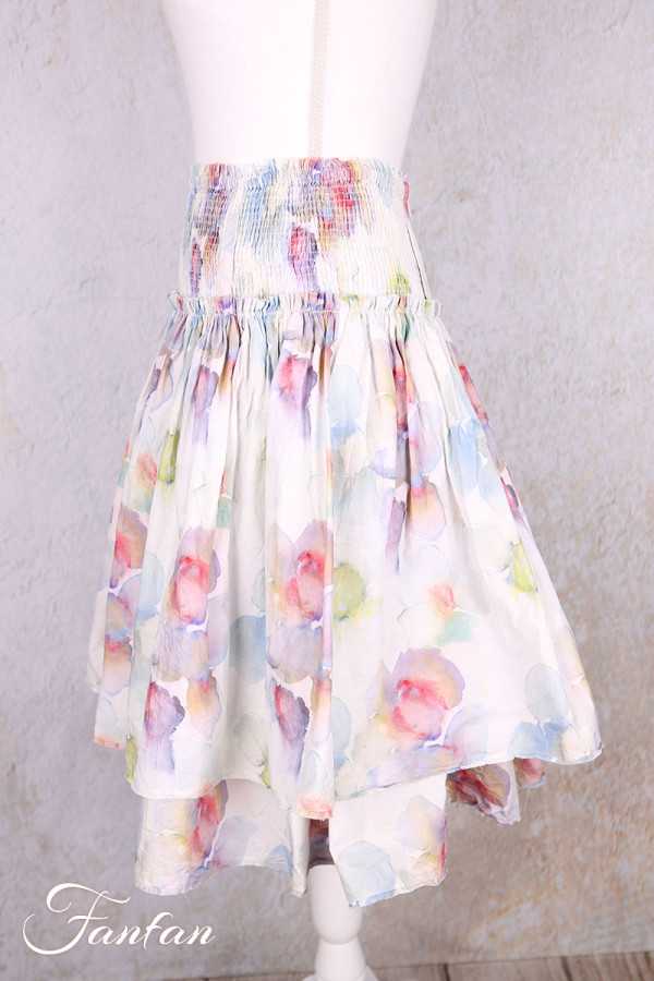 Très belle jupe mi-longue en popeline de coton avec bel imprimé dans les tons pastel, taille à smocks, belle ampleur composée de 2 volants superposés