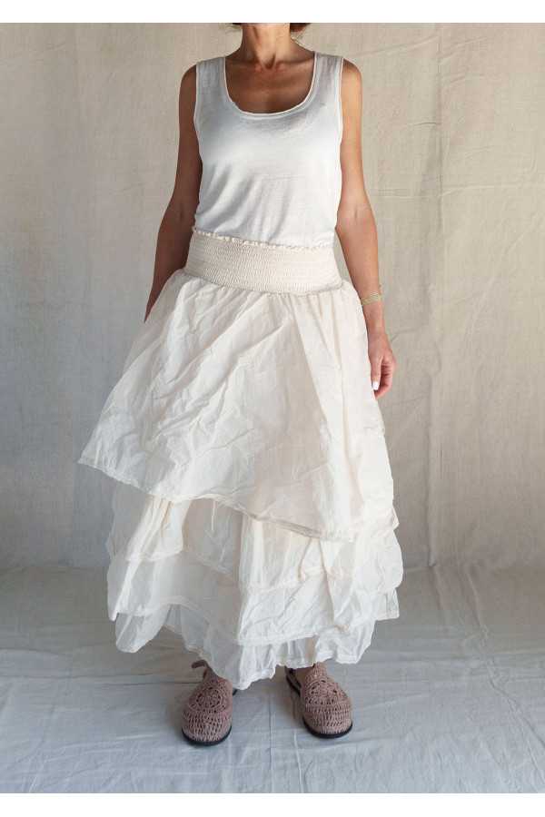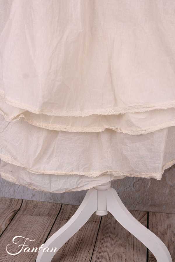 Magnifique jupon en organza de coton composé de quatre superpositions de volants avec finition en dentelle ancienne, taille largement smockée qui convient à de nombreuses morphologies. Peut se porter en jupe ou en jupon avec beaucoup de pièces de la saison.