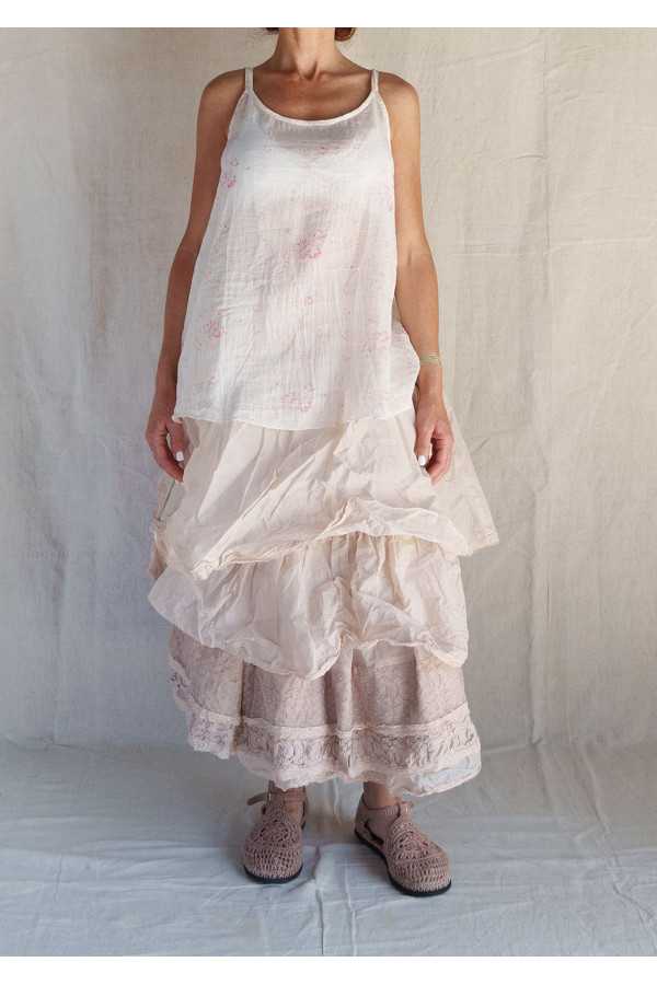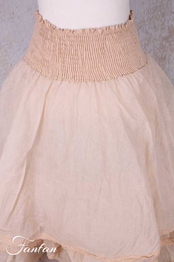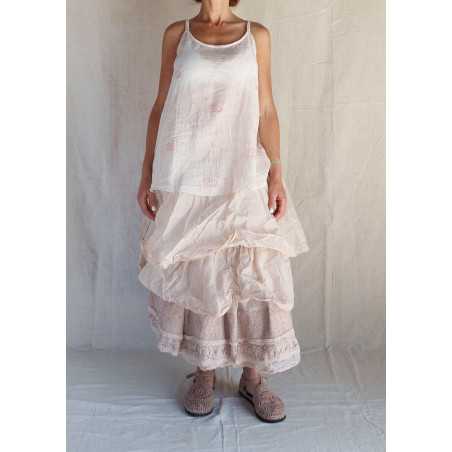 Magnifique jupon en organza de coton composé de quatre superpositions de volants avec finition en dentelle ancienne, taille largement smockée qui convient à de nombreuses morphologies. Peut se porter en jupe ou en jupon avec beaucoup de pièces de la saison.