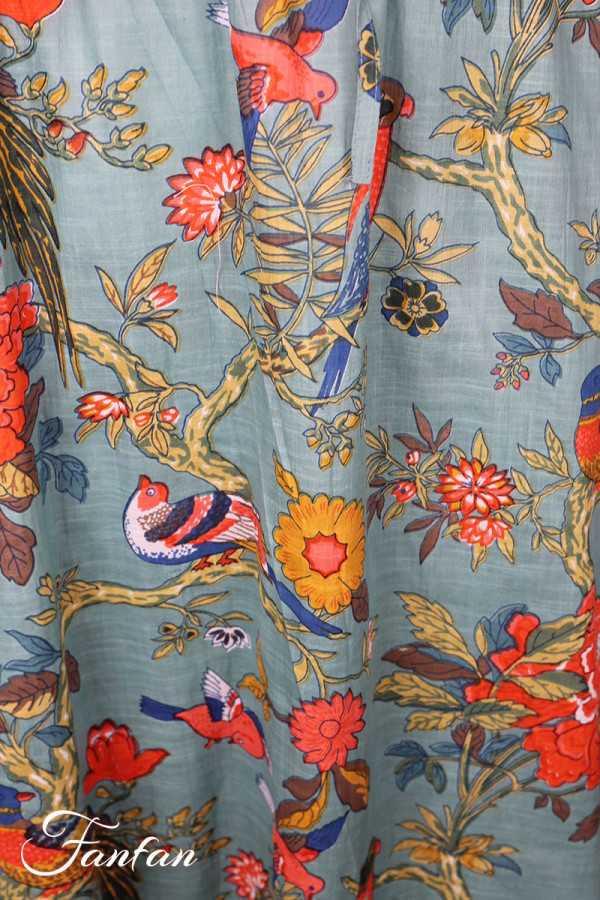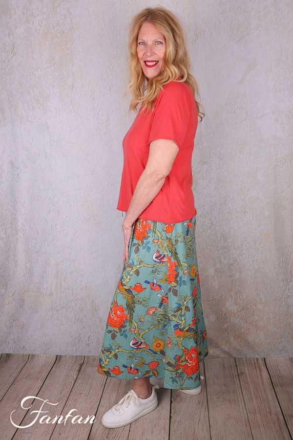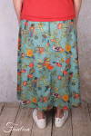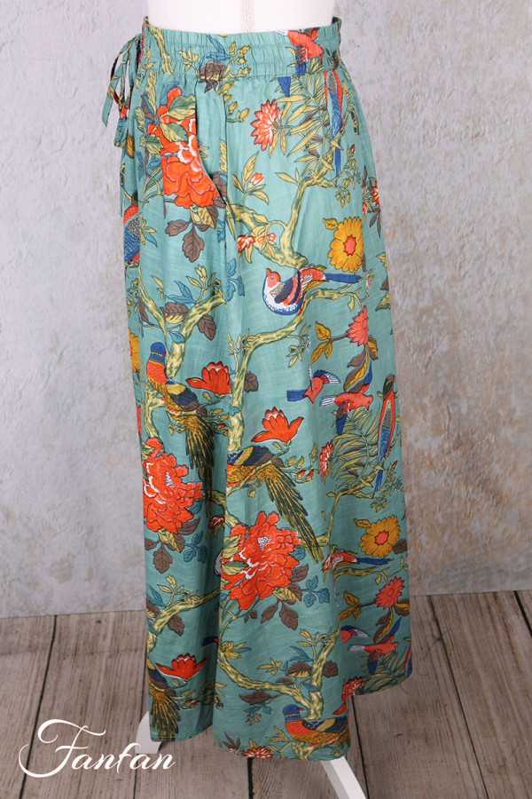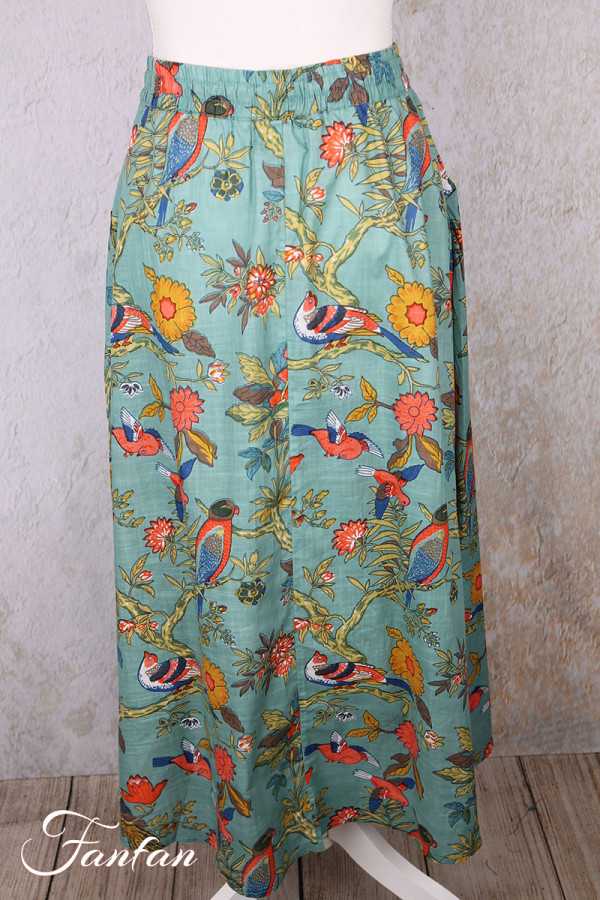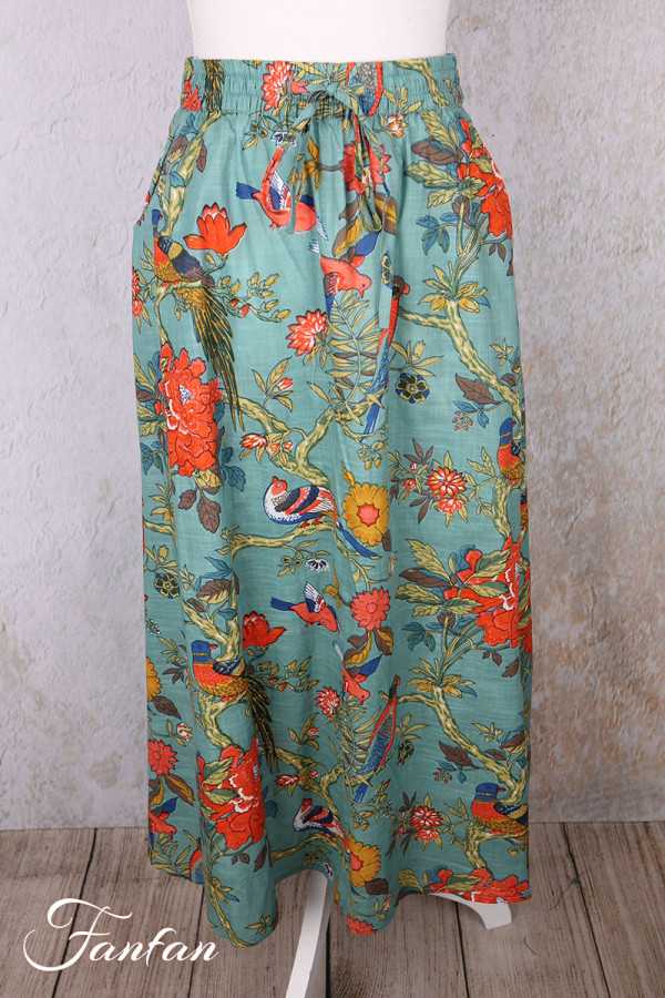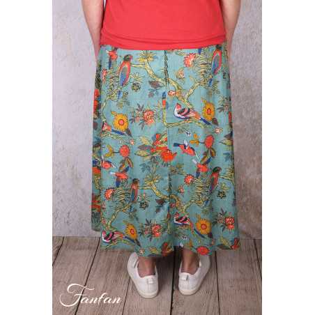Jupe mi-longue en coton léger avec bel imprimé avec oiseaux et fleurs, idéale pour la belle saison, taille avec élastique et lien à nouer sur l'avant, coupe trapèze évasée dans le bas, poches cachées sur les côtés.