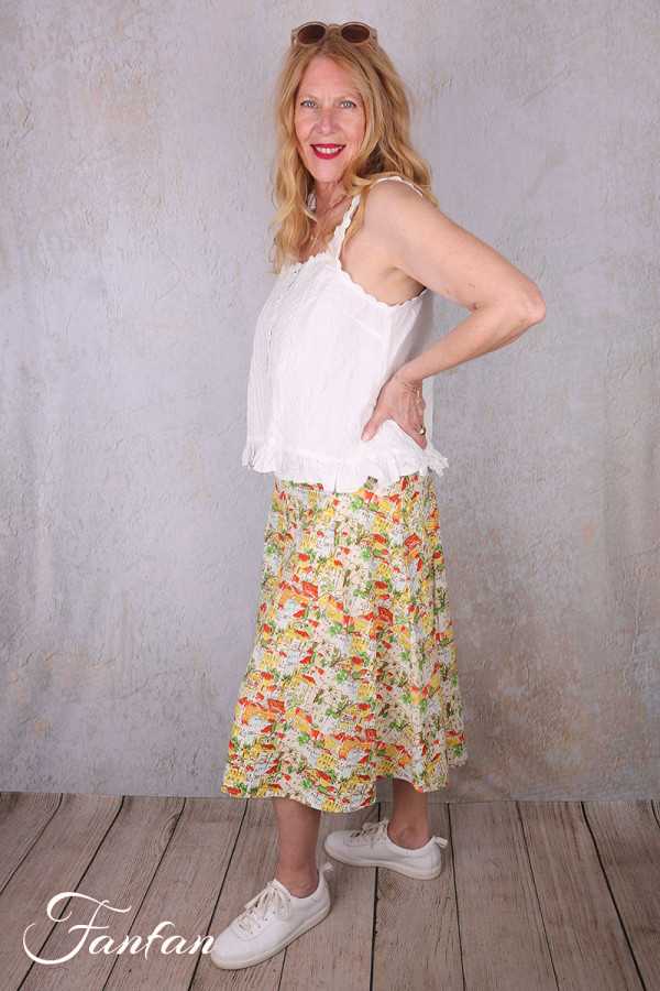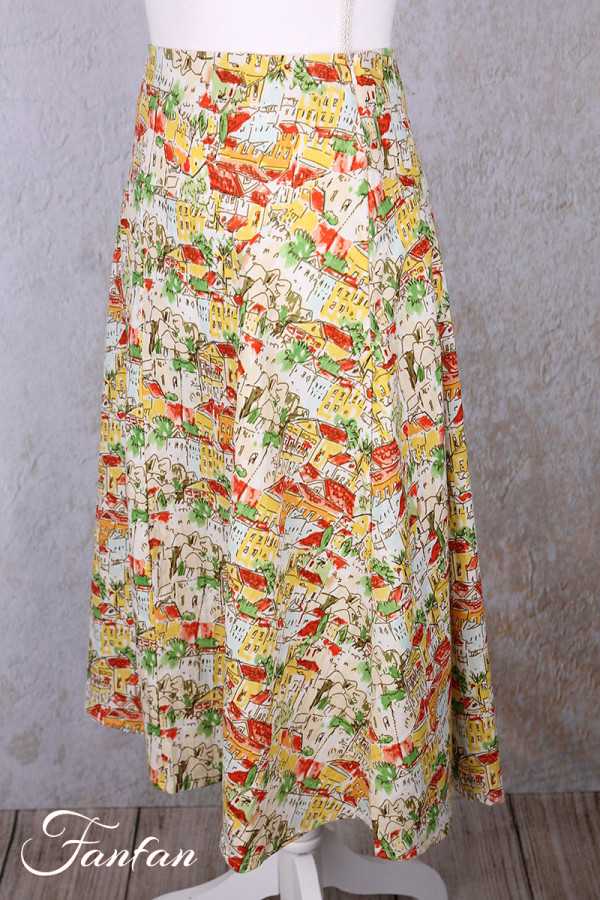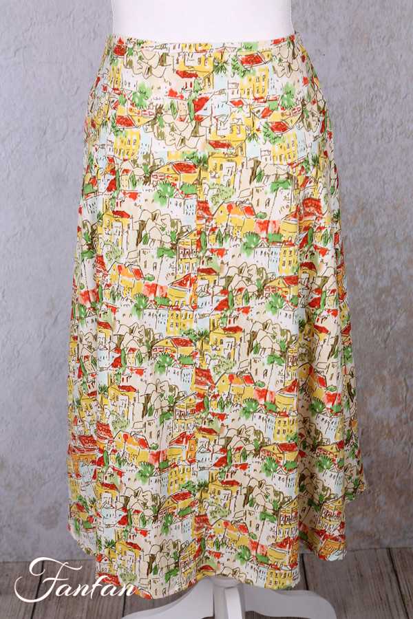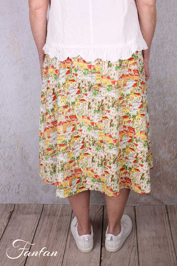 Jolie jupe mi-longue en coton bio avec bel imprimé de villages sur fond jaune, fermeture zip sur le côté, coupe évasée dans le bas. la marque taille légèrement petit, n'hésitez pas à nous contacter pour les mesures qui vous intéressent.