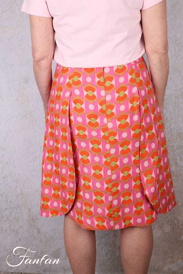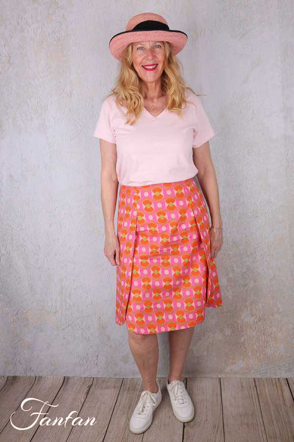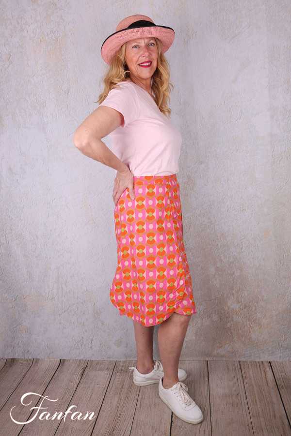 BlaBla Jupe en coton bio avec bel imprimé orange, rose et ver, coupe trapèze avec deux pans arrondis sur les côtés, zip dans le dos