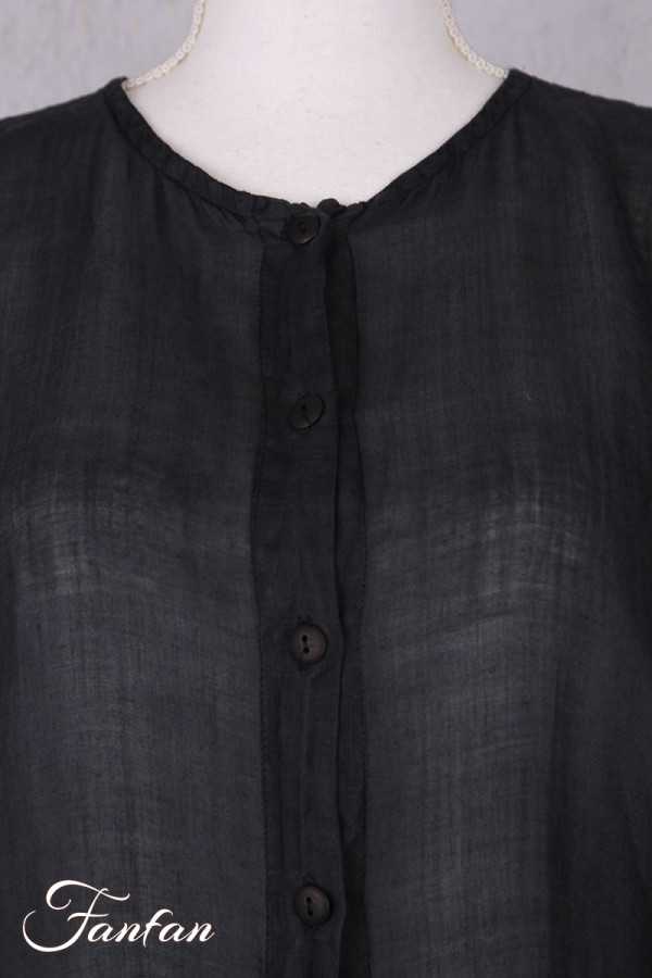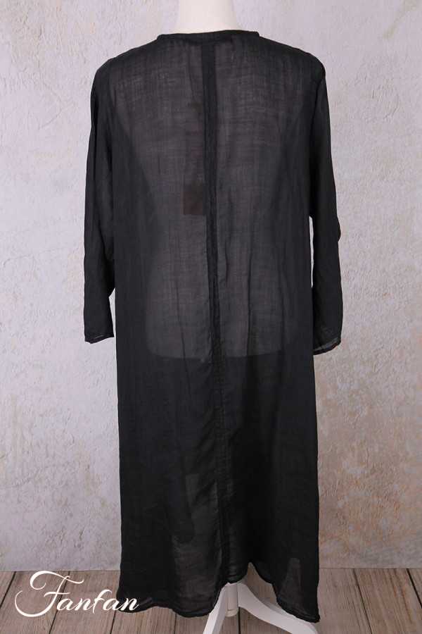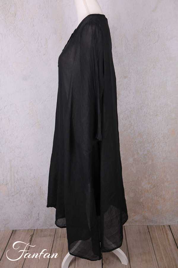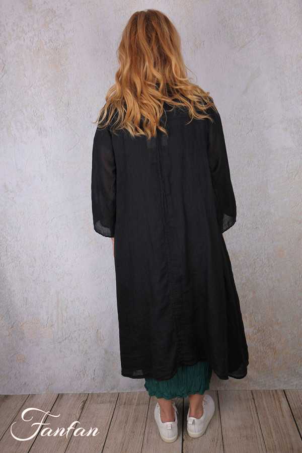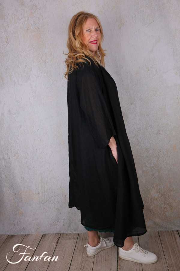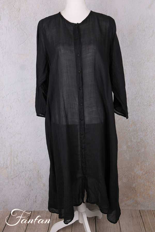 Superbe manteau en ramie entièrement teintée à la main, manches longues, coupe trapèze très évasée dans le bas, fermeture par petits boutons en nacre sur l'avant, col rond, poches dans les coutures, taille unique qui convient à de nombreuses morphologies. Pièce exceptionnelle qui fera d'une tenue toute simple un look très élégant.