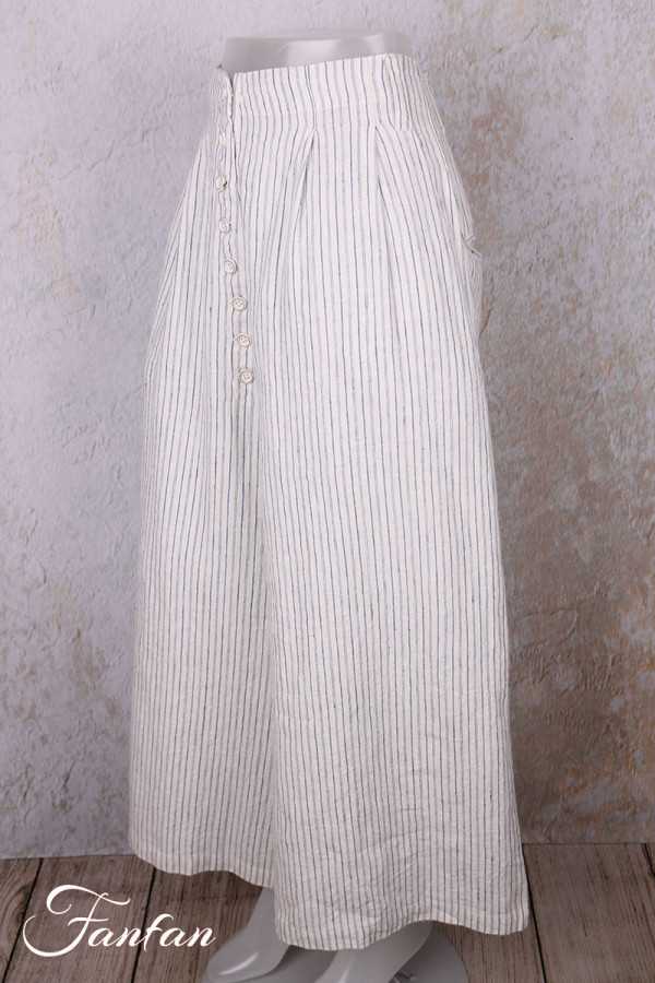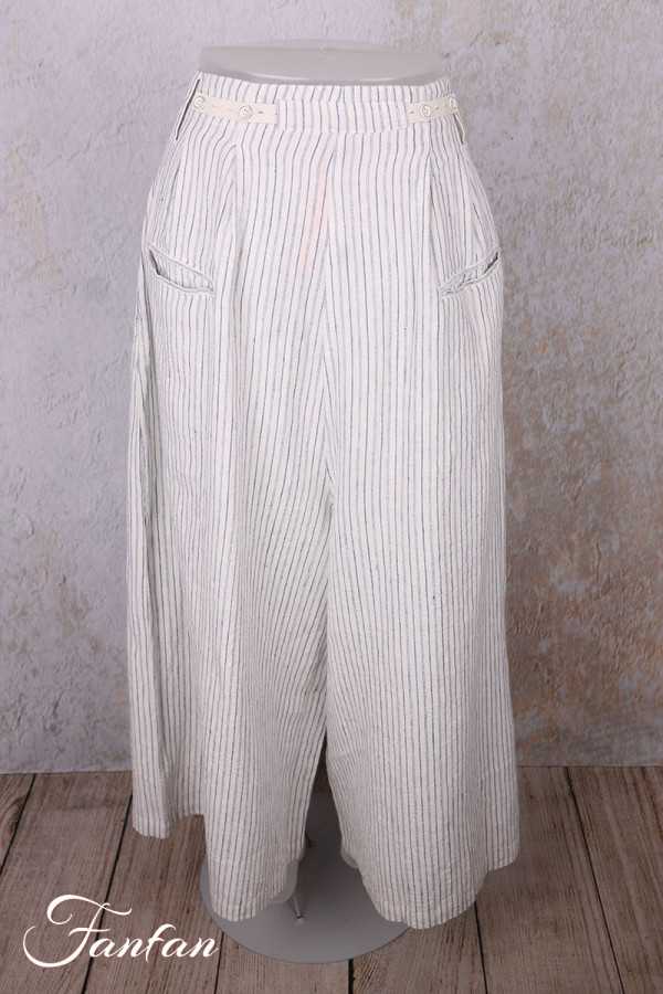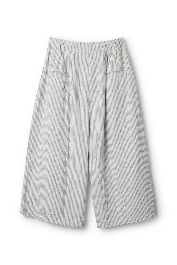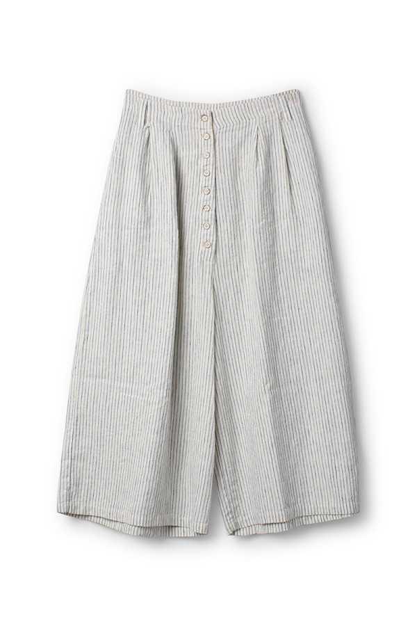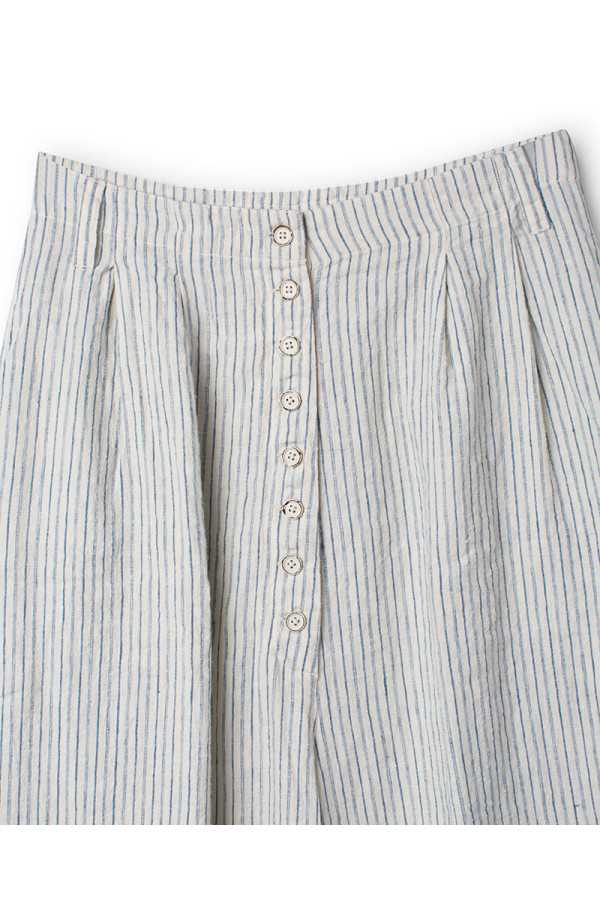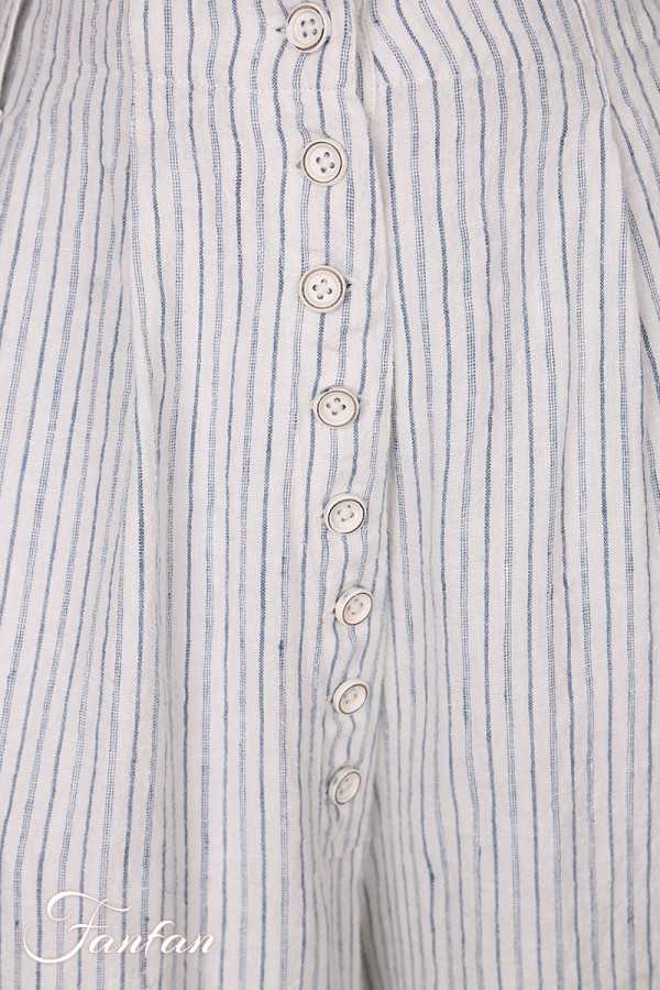 Pantalon Ewa I Walla en lin et coton, rayé bleu, coupe ample et confortable. Taille avec passants et boutonnage sur le devant, deux poches. Style naturel et romantique.