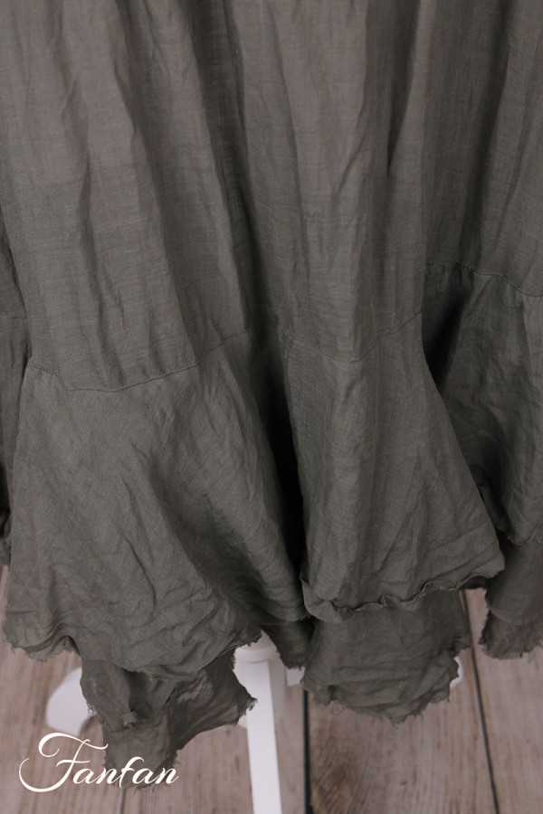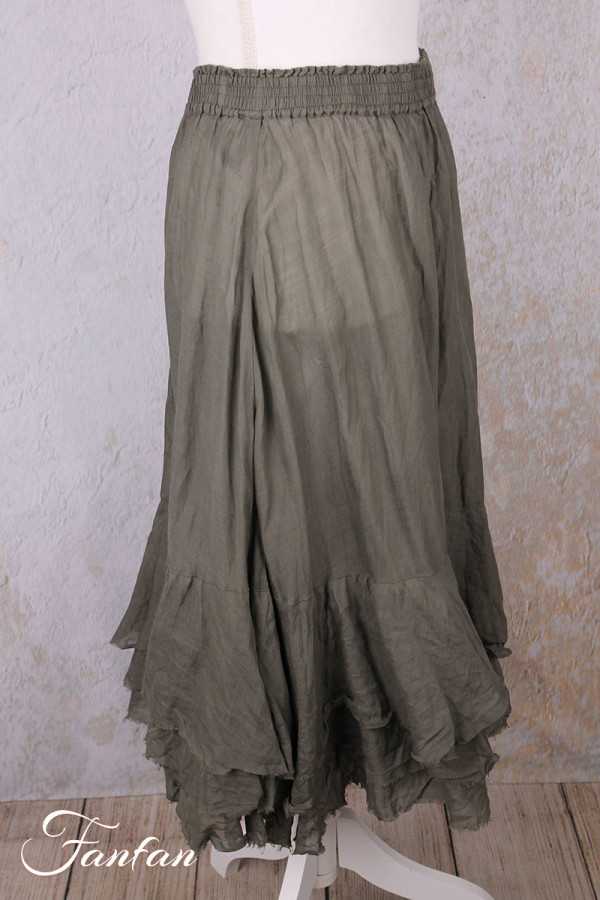 Jupe longue en ramie , appelée également soie végétale, teintée à la main. Bas de la jupe avec trois rangs de volants finition effilochée, taille avec élastique. Idéale pour les superpositions ou lagenlook.