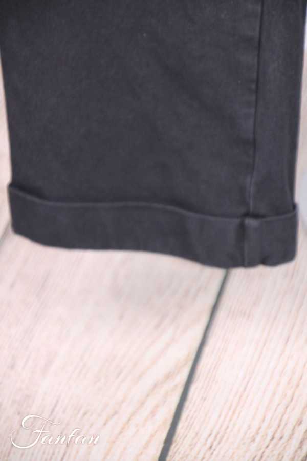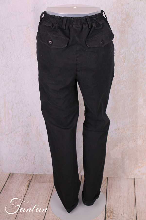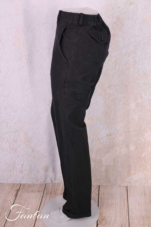 Très beau pantalon en coton bio épais légèrement extensible, élastique smocké dans le dos de la taille, passants pour ceinture, fausse braguette, poches en biais sur l'avant deux poches avec revers et bouton dans le dos, coupe droite et un peu ample, revers dans le bas du pantalon