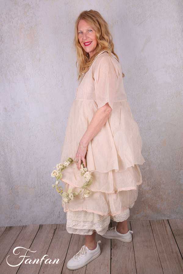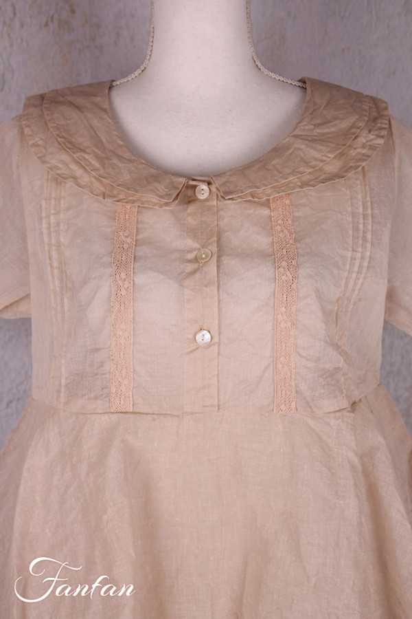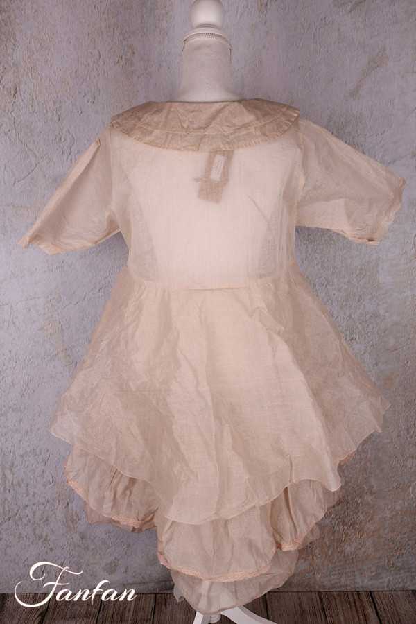 Superbe robe en organza de coton, manches courtes, col rond avec double col Claudine, coupe droite jusque sous la poitrine avec 3 petits boutons sur l'avant et bande de dentelle ancienne et petits plis religieuse, 3 grands volants dans le bas avec belle ampleur