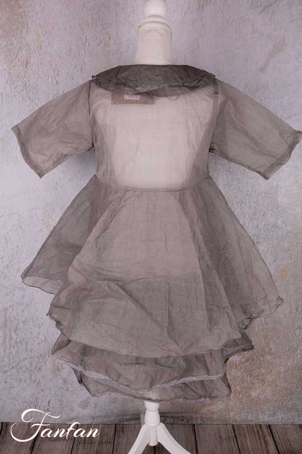 Superbe robe en organza de coton, manches courtes, col rond avec double col Claudine, coupe droite jusque sous la poitrine avec 3 petits boutons sur l'avant et bande de dentelle ancienne et petits plis religieuse, 3 grands volants dans le bas avec belle ampleur