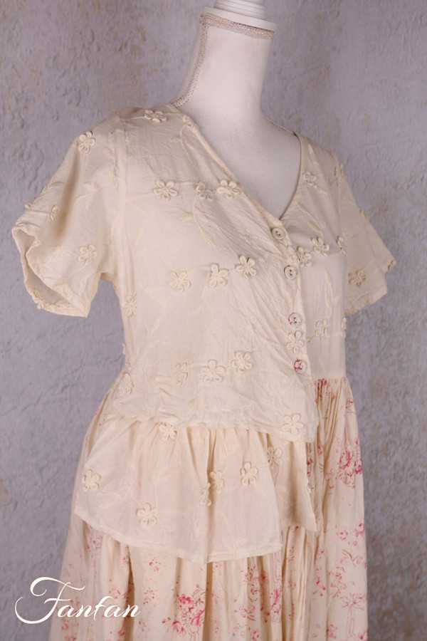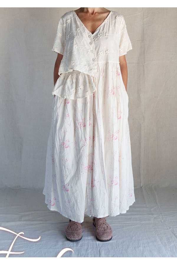 Magnifique robe longue à manches courtes, 2 poches cachées dans les coutures, boutons recouverts de coton sur le buste, haut de la robe en coton avec fleurs brodées, le bas en coton liberty fleurs avec grand volant sur le côté gauche