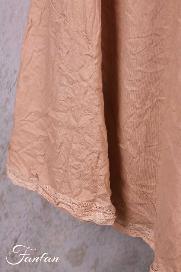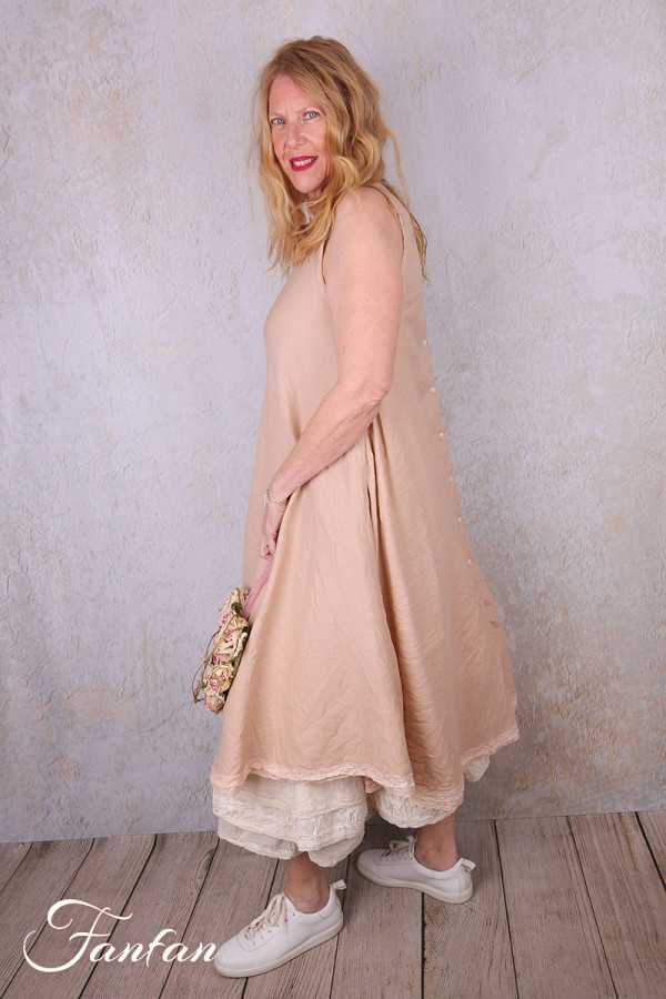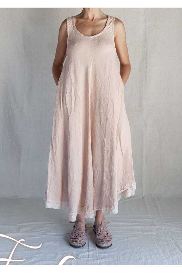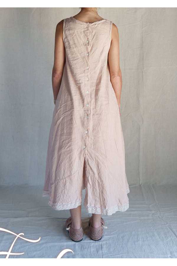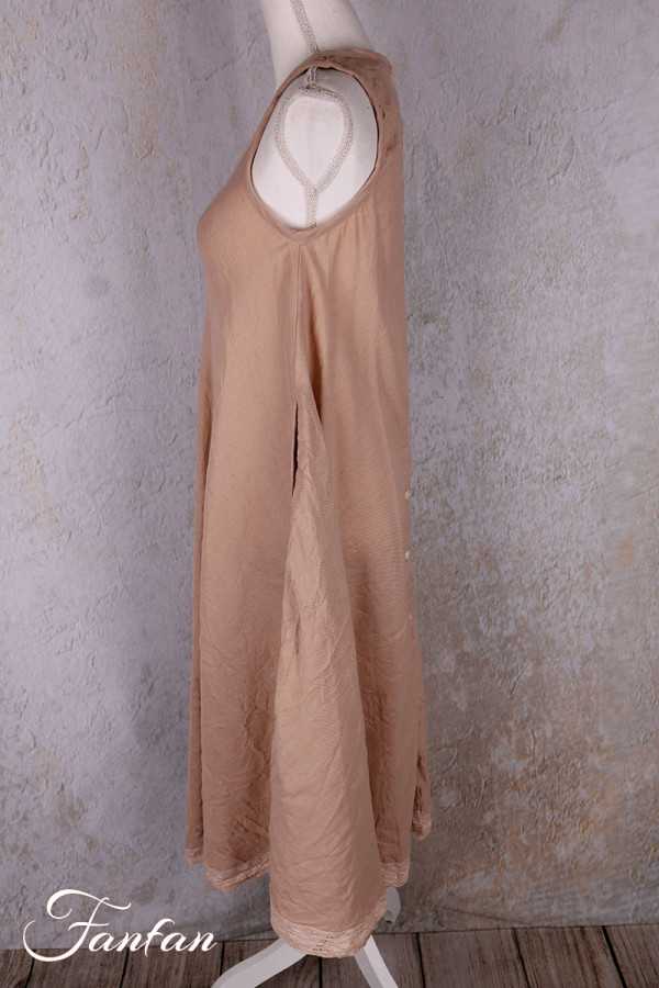 Très jolie robe longue sans manches en coton et lin, coupe trapèze avec belle ampleur dans le bas, poches cachées dans les coutures, dentelle coton dans le bas, ouverture totale dans le dos avec petits boutons, col rond