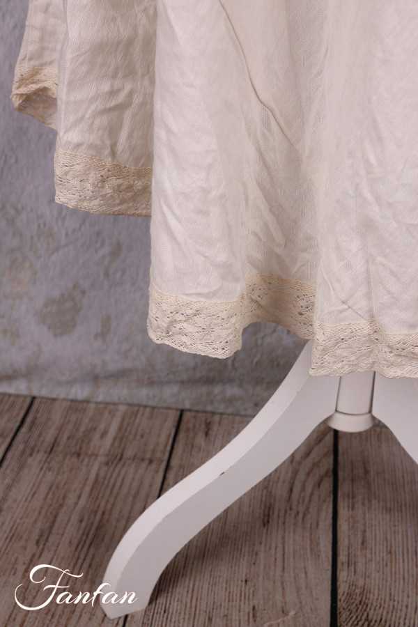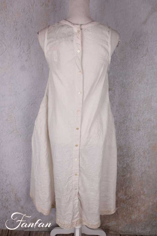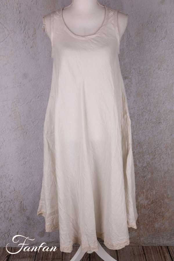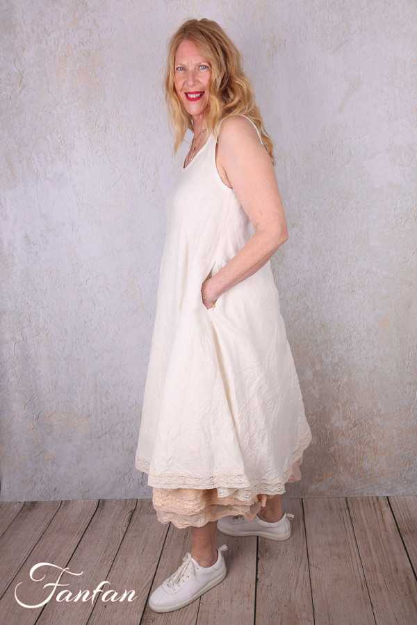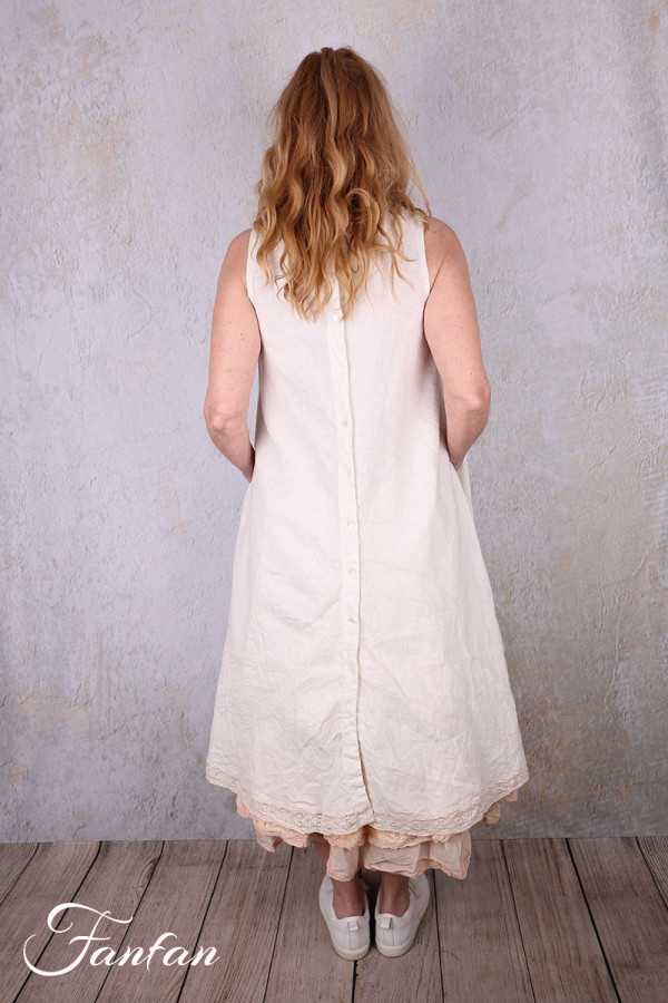 Très jolie robe longue sans manches en coton et lin, coupe trapèze avec belle ampleur dans le bas, poches cachées dans les coutures, dentelle coton dans le bas, ouverture totale dans le dos avec petits boutons, col rond
