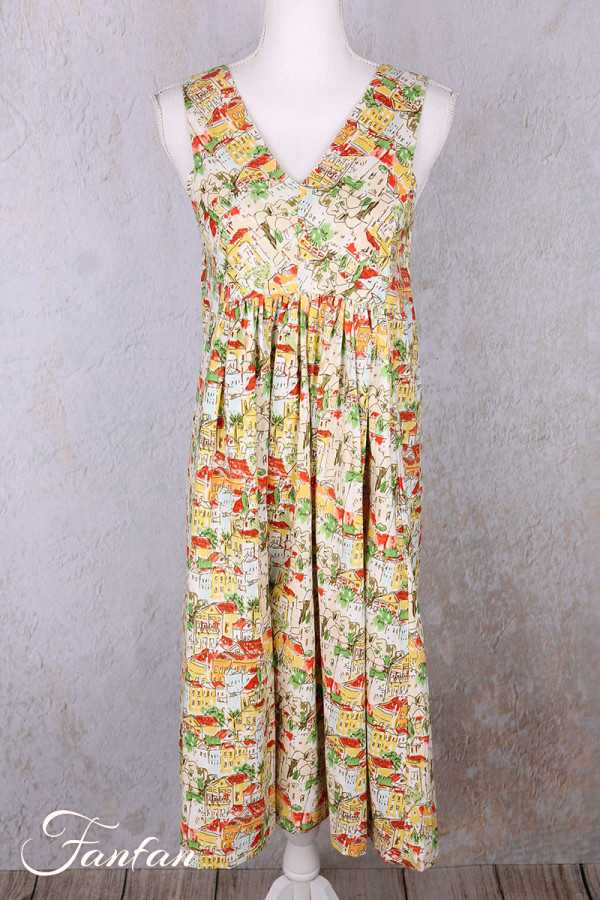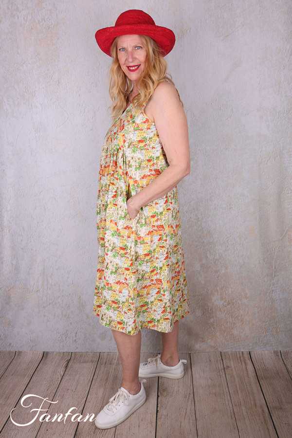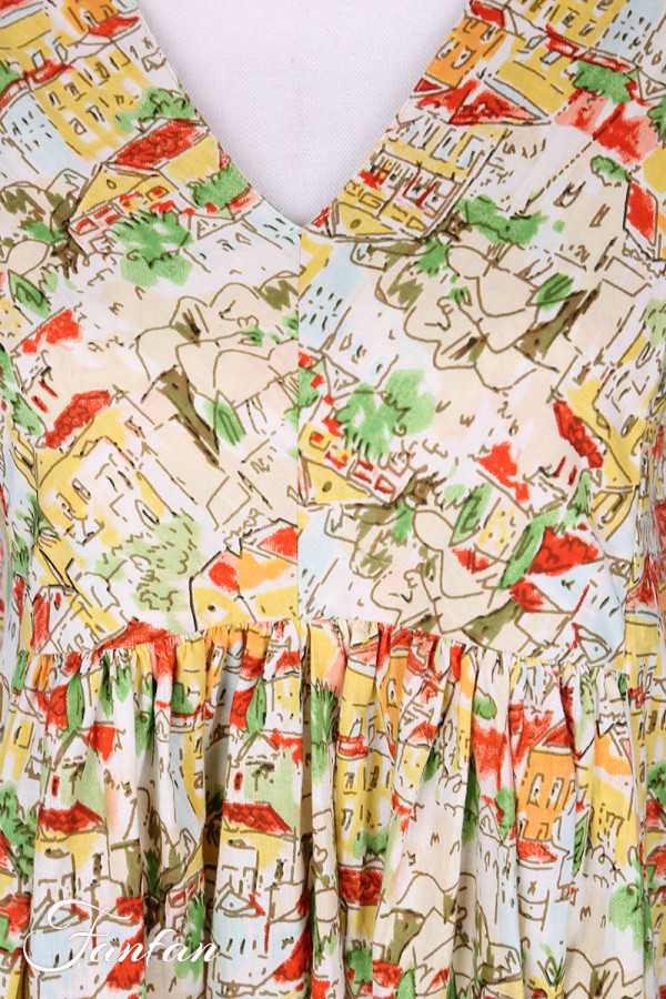 Jolie robe estivale sans manches en coton bio avec bel imprimé sur le thème des village sur fond jaune, découpe en V sur l'avant et dans le dos, coupe trapèze avec fronçage sous la poitrine, poches cachées dans les coutures. Taille légèrement petit. N'hésitez pas à nous contacter pour les mesures des tailles qui vous intéressent.