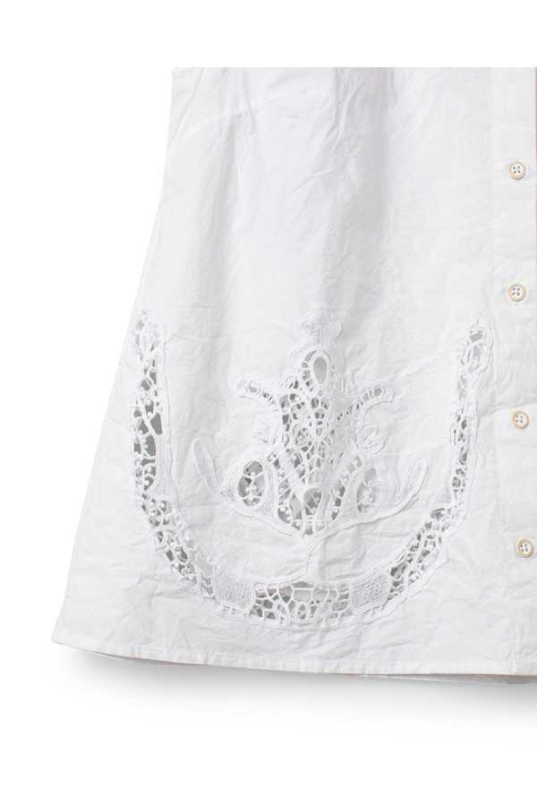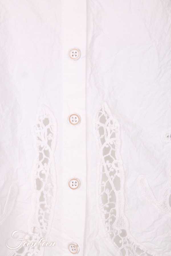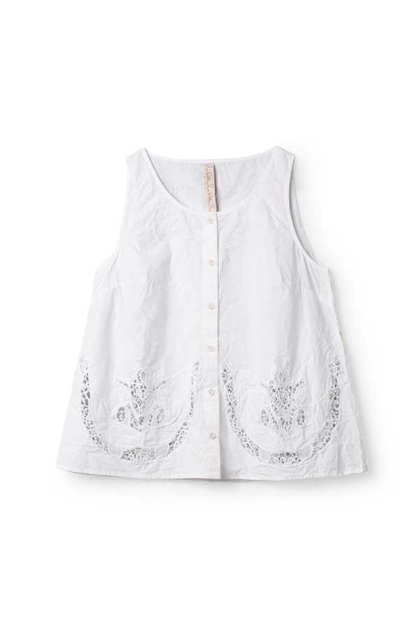 Top Ewa I Walla Laurel en coton bio blanc, orné de broderies travaillées à l’avant et au dos. Coupe fluide, boutonnage devant. Une pièce lumineuse et raffinée au charme intemporel.