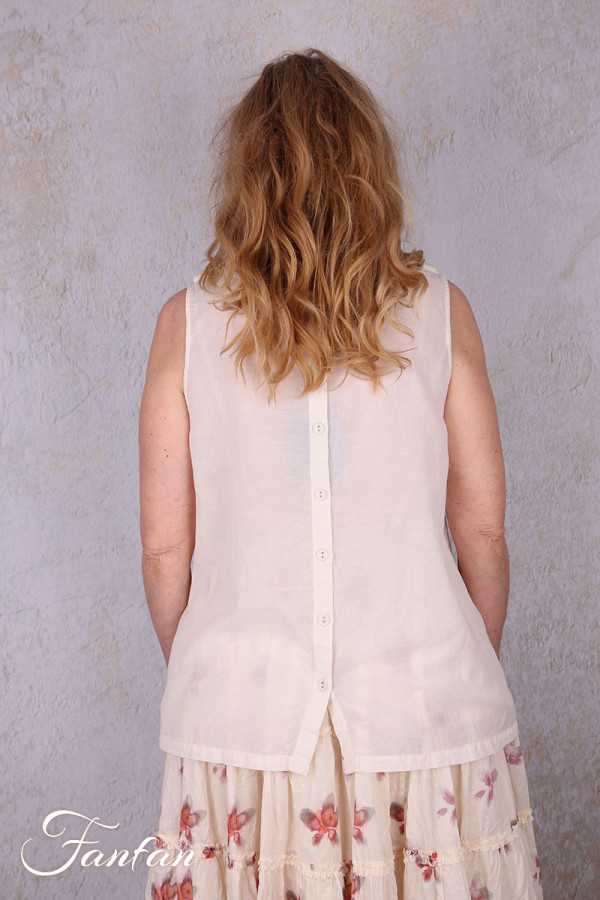 Ce top se porte aussi bien avec une jupe fluide qu’un pantalon en lin. Il s’intègre naturellement dans un vestiaire féminin, élégant et intemporel, parfait pour des silhouettes légères et harmonieuses.