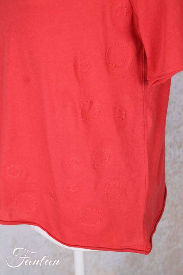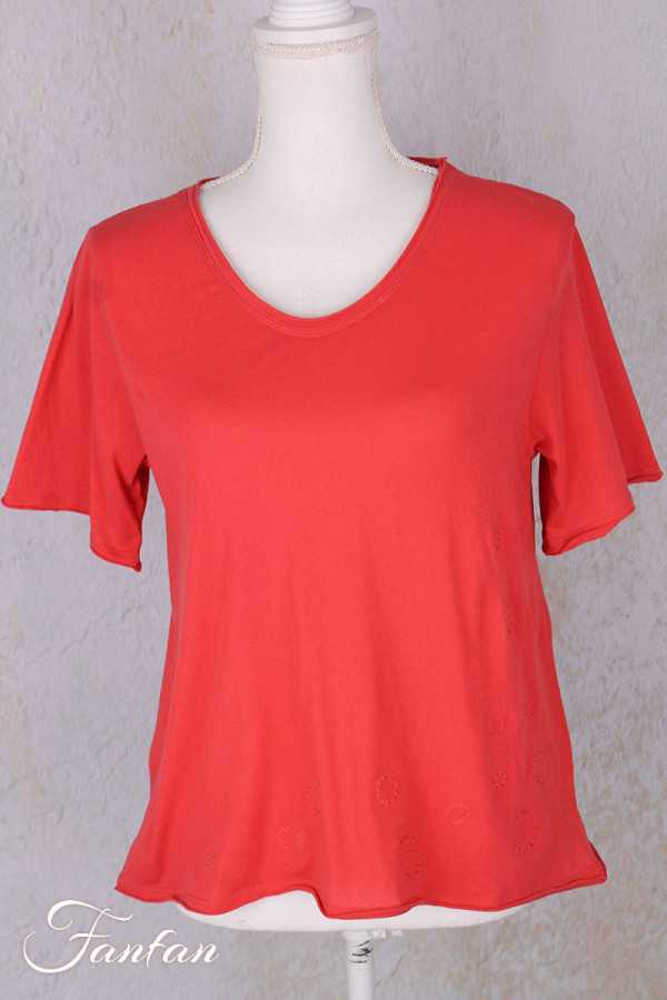Joli t-shirt en jersey de coton très doux, manches courtes, col en V, coupe trapèze, finitions légèrement roulées, ronds surpiqués sur le côté droit du top