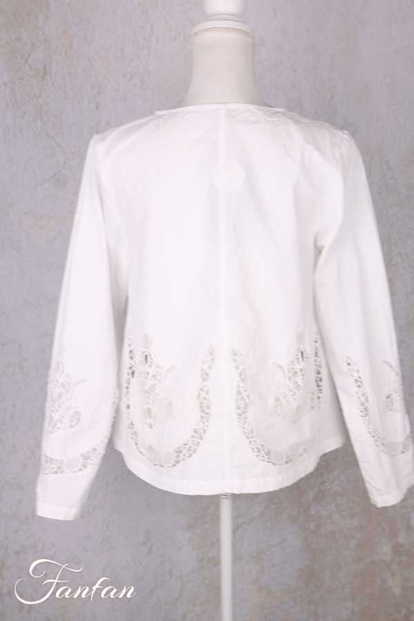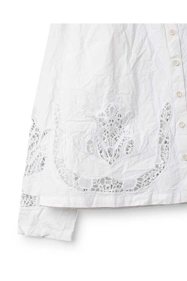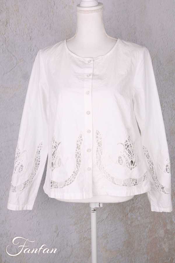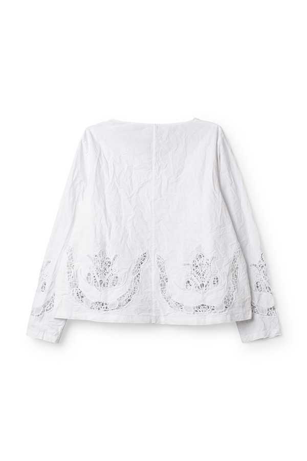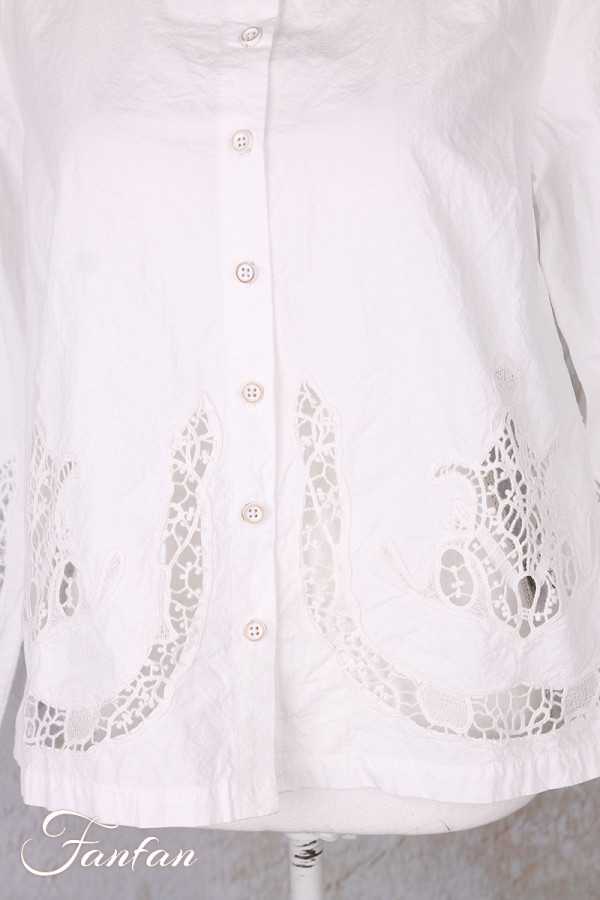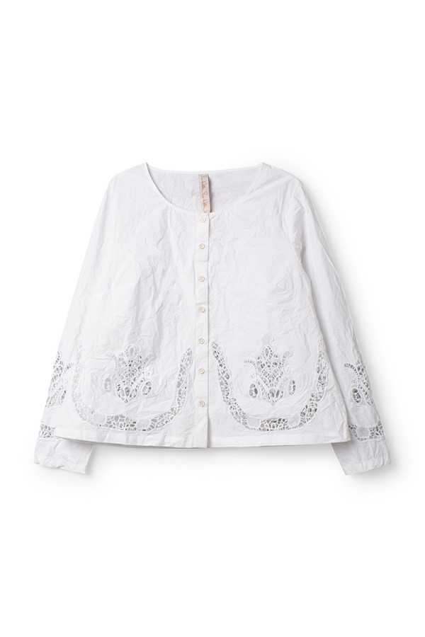 Belle blouse en coton, manches longues avec superbe dentelle ajourée dans le bas de la manche, col rond, entièrement boutonnée sur l'avant, coupe trapèze avec dentelle ajourée dans le bas