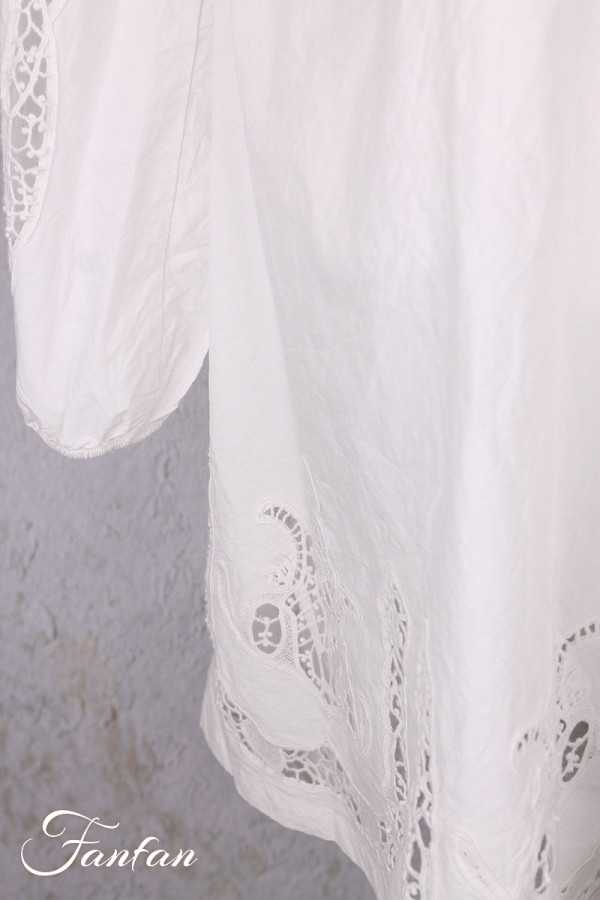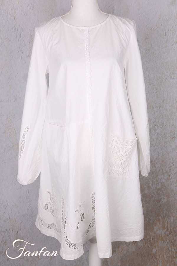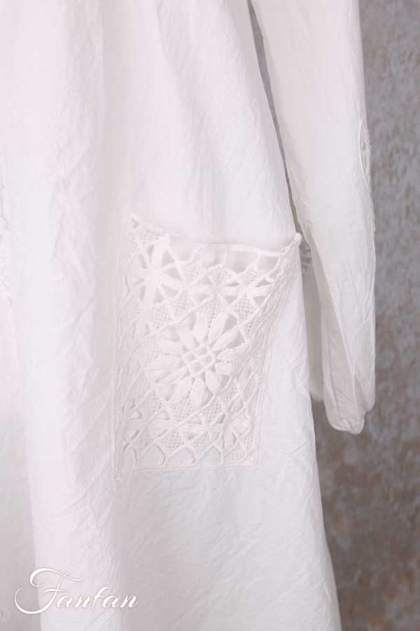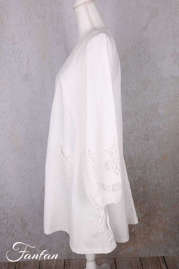 Tunique en coton ornée de délicates dentelles transparentes et de manches longues à ourlet élastiqué. Plis piqués aux épaules, volant froncé sur le devant et fermeture boutonnée au dos. Poche passepoilée à droite, poche extérieure en dentelle et coulisse avec cordon de serrage sur la couture latérale gauche.