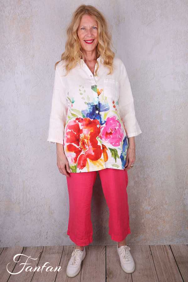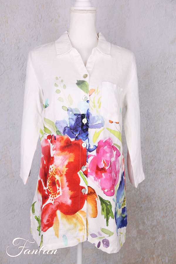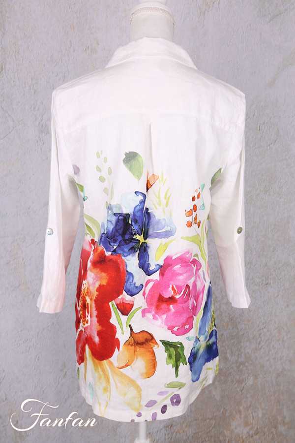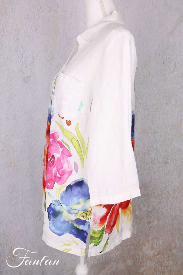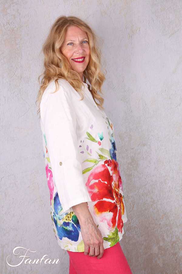 Jolie liquette en lin avec bel imprimé à grandes fleurs tiré d'une oeuvre de Basak Erarslan "Spring Delight", petit col chemise, boutonnée sur l'avant, manches 3/4 avec lien à remonter et à boutonner pour en faire des manches courtes. N'hésitez pas à nous contacter pour les mesures des tailles qui vous intéressent.