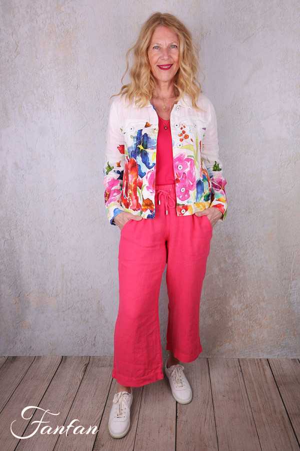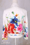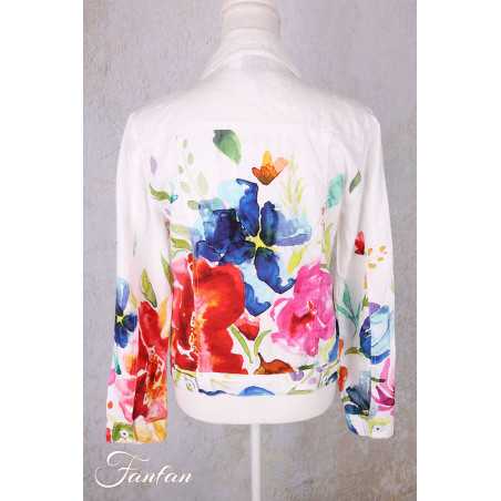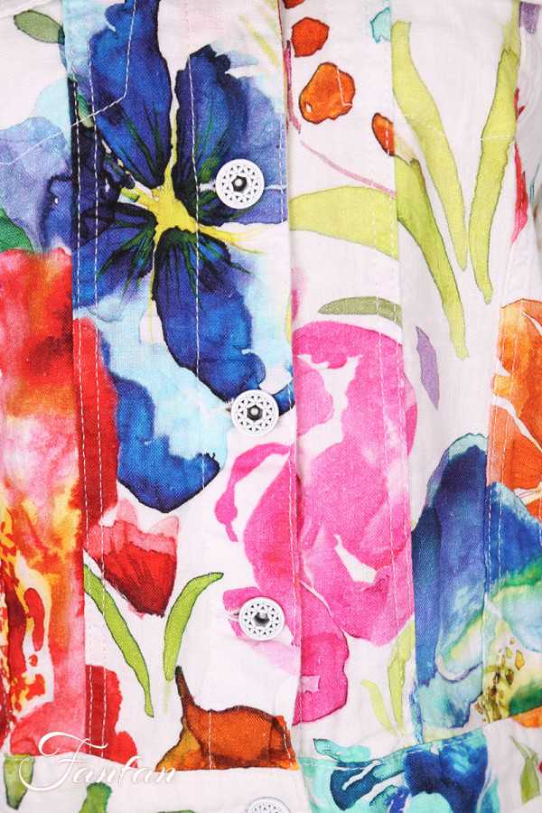 Très beau blouson en lin avec imprimé tiré d'une oeuvre de Basak Erarslan "Spring Delight", manches longues avec fermeture par bouton aux poignets, col chemise, boutonné sur l'avant, 2 poches à rabat sur la poitrine et 2 poches cachées dans le bas. N'hésitez pas à nous contacter pour avoir des mesures des tailles qui vous intéressent.