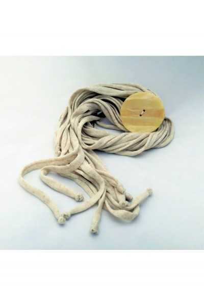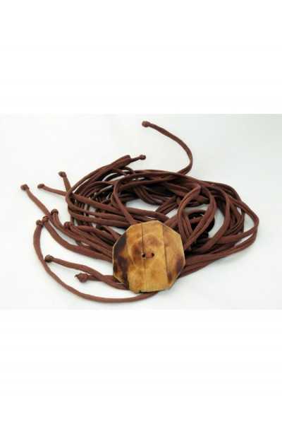 Necklace made of long cotton bands decorated in the centre with a bone button. It can be used as a belt, scarf or necklace to decorate a hat or basket.