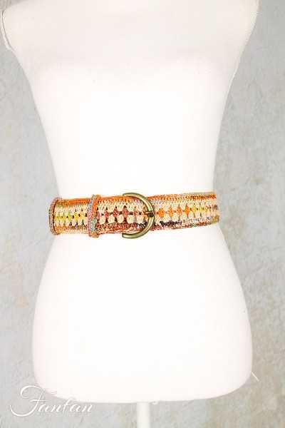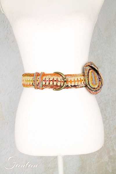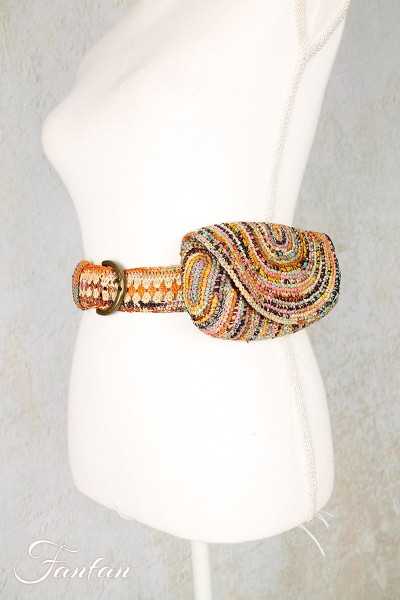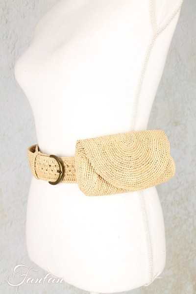 Superb raffia belt, entirely handmade, fair trade from Madagascar, crocheted, metal buckle, fits all sizes. Can be worn with the coordinating pouch to be threaded into the belt. Beautiful piece