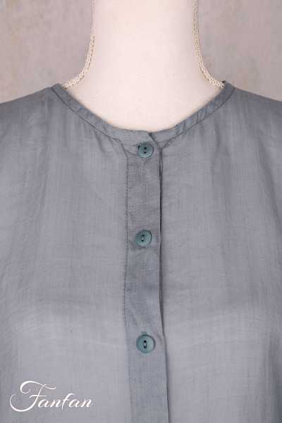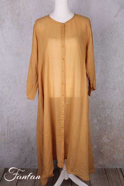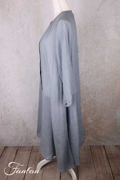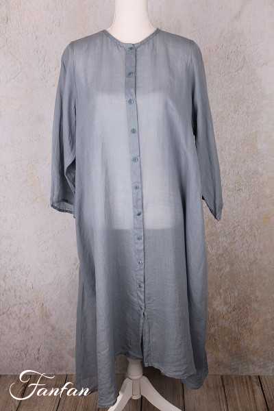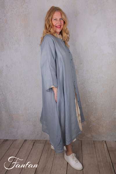 Superb hand-dyed ramie coat, long sleeves, trapeze cut, flared at the bottom, small mother-of-pearl button front closure, round collar, seam pockets, one size fits all. An exceptional piece that will turn a simple outfit into a very elegant look.