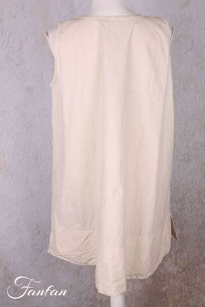 Long tunic or short sleeveless dress, round collar, crinkled cotton, trapeze cut with double hem at bottom, small slit at sides. Wide waist