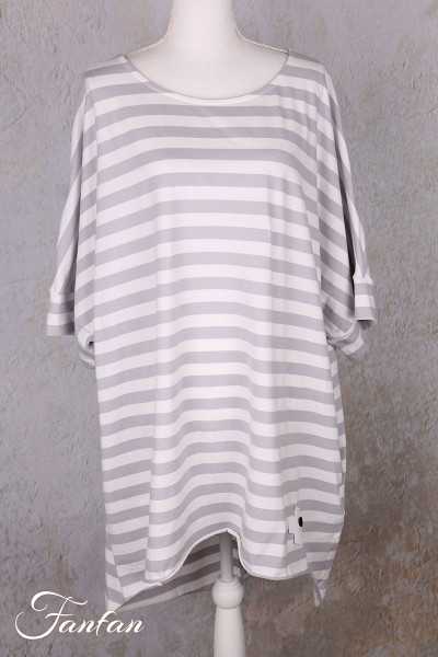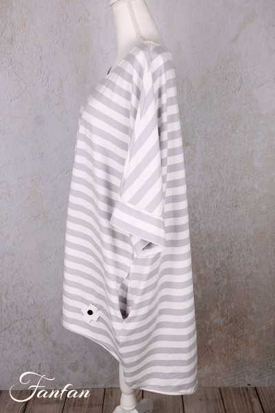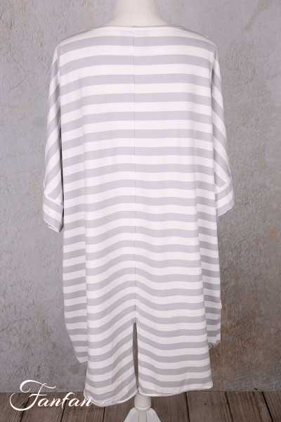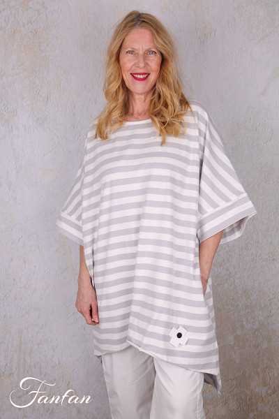 Superb long, loose top in striped stretch cotton, short drop sleeves, large round collar, longer cut in back with 2 points, large patchwork cross in back, rolled hem finish, 2 hidden pockets in seams.