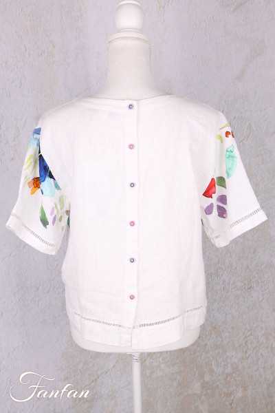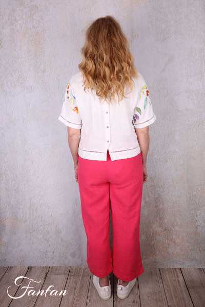 Very pretty short linen top, short sleeves with openwork trim, round collar, fully buttoned at back with small buttons in several colors, openwork trim at bottom, superb print from a Basak Erarslan "Spring Delight" work. Please contact us for measurements of the sizes you are interested in