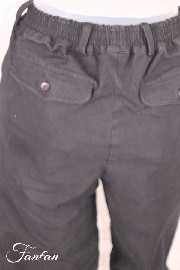 Very nice pair of pants in thick, slightly stretch organic cotton, smocked elastic at back waist, belt loops, false fly, slanted front pockets, two back pockets with cuffs and button, straight, slightly loose fit, cuffs at bottom of pants